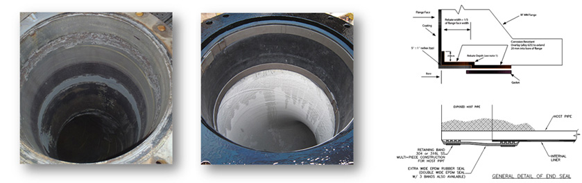 | 그런 다음 CIPP 끝단과 호스트 파이프 액세스와 겹치는 엔드 씰이 설치되어 호스트 파이프와 라이닝 사이의 침투를 방지함. | CIPP 라이너의 엔드 씰 종단의 기존 설계는 틈새 및 응력 부식을 초래하는 연결부에서 폐수 침투가 발생 부식이 생기기 시작함. | 당사의 엔드 씰 디자인은 틈새 부식 또는 추가 열화를 초래할 수있는 플랜지면 에서의 어떠한 유형의 침투도 방지함. |
